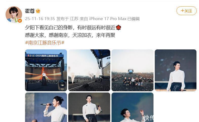 据封面新闻消息,11月16日,霍尊亮相南京江豚音乐节,连着带来《星落》《红颜劫》《天行九歌》《夕阳下的奔跑》《卷珠帘》《归一》等九首歌曲。结束后,霍尊晒出现场图发文:“夕阳下看见自己的身影,有时很远有时很近。感谢大家,感谢南京,天凉加衣,来年再聚。”